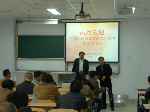 11月3日下午,江苏快达农化有限公司一行40余人在公司施总和韩总的带领下来到英国365公司参观考察,英国365公司院长石玉军教授代表学院党政热情接待了公司领导和生产一线的技术骨干。