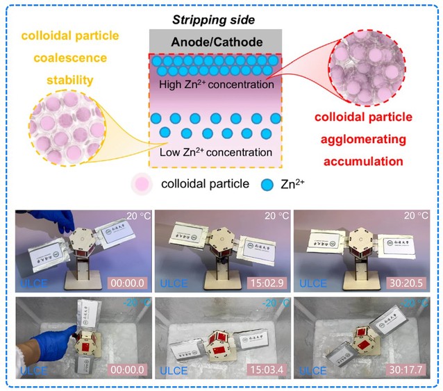 电解质技术的突破是推动电池革命向前发展的关键因素。胶体电解质作为新兴电解质之一,由于其在不同条件下(水/非水溶剂、盐浓度等)的复杂胶体行为和机理作用,将引起人们的广泛研究兴趣。基于此,钱涛教授研究团队设计了具有超低盐浓度和固有低冰点的“超水”胶体电解质,研究了其稳定低温锌金属电池的潜在机理。令人印象深刻的是,电极/电解质界面上的浓度极化会破坏电解质的聚结稳定性,形成富含胶体颗粒层的机械刚性界面,从而抑制正负极的副反应,实现-80 °C超低温环境中高正极负载软包电池的稳定循环,并在20和-20 °C下供电卫星模型的低速旋转,显示出其在寒冷环境中实际应用的巨大潜力。