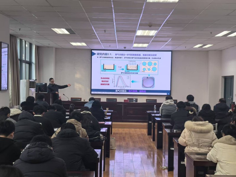 在本次报告中,潘建明教授主要介绍了纳米乳液可控构建二氧化硅功能吸附剂及其血液拓铅性能研究,还分享了其简单、低成本、易量产的合成方法,为医药、纳米等领域提供了全新的研究视角。潘建明教授的报告内容丰富多彩,生动有趣,潘教授结合自己研究领域向学院教师、研究生传授了如何选题、如何深入研究等宝贵经验。报告结束后,潘教授与现场教师、学生积极互动,耐心地回答了教师和学生的提问,令在场师生收获颇丰。(黄强)