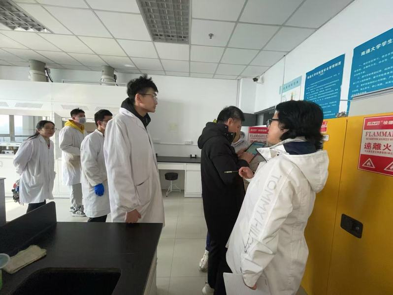 "实验柜药品动态标签要细化到每日使用日期!""气瓶固定架必须加装防倒链!"在8楼有机材料合成实验室,李书记和工作组老师一边翻看危化品领用台账,一边提醒学生规范操作。工作组逐一核查了实验室安全责任牌信息、设备使用记录,并对危化品双人双锁管理、废液分类存放等关键环节进行重点督查。
