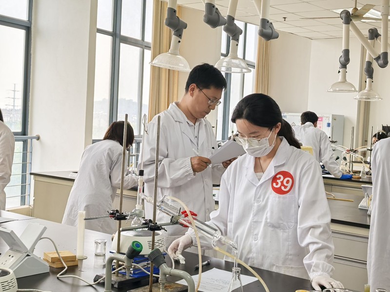 决赛伊始,参赛选手们通过现场抽签的方式完成无机化学实验和有机化学实验等竞赛单元。在实验比赛现场,选手们有条不紊地进行操作。他们熟练称取,按需取用试剂;规范使用各种实验仪器;完成实验及时记录数据,保证数据准确性。实验过程中,参赛者及时查找问题,解决问题。整个赛场秩序井然,展现出化学实验应有的规范与严谨。评委老师穿梭于各个实验台之间,细致观察选手的操作细节,对实验操作的规范性、准确性、熟练度以及实验安全意识、实验台面整洁度等方面进行了全面、严格的现场评判。