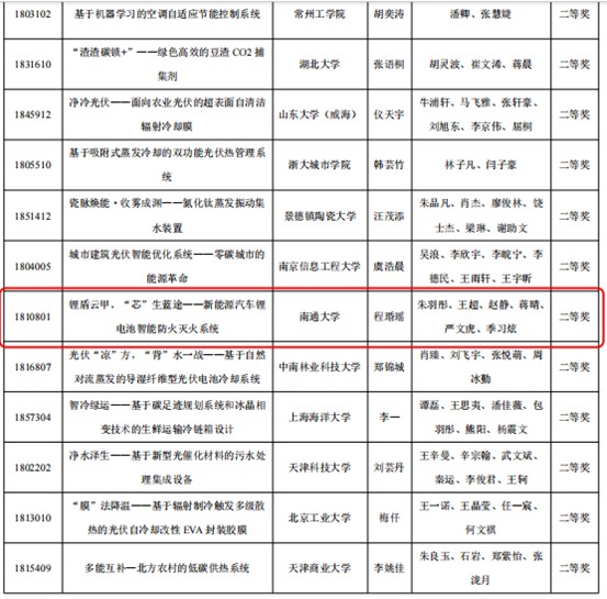 8月8日-11日,由教育部高等学校能源动力类专业教学指导委员会指导、全国大学生节能减排社会实践与科技竞赛委员会主办、东北石油大学承办的“招行杯”第十八届全国大学生节能减排社会实践与科技竞赛决赛在大庆市举办。经过省赛、网评、会评和决赛等阶段的层层选拔,我院学生参赛作品《锂盾云甲,“芯”生蓝途——新能源汽车锂电池智能防火灭火系统》(学生:程瑉瑶、朱羽彤、王超、赵静、蒋晴、严文虎、季习炫等,指导教师:鞠剑峰、刘思鸶)斩获全国二等奖。