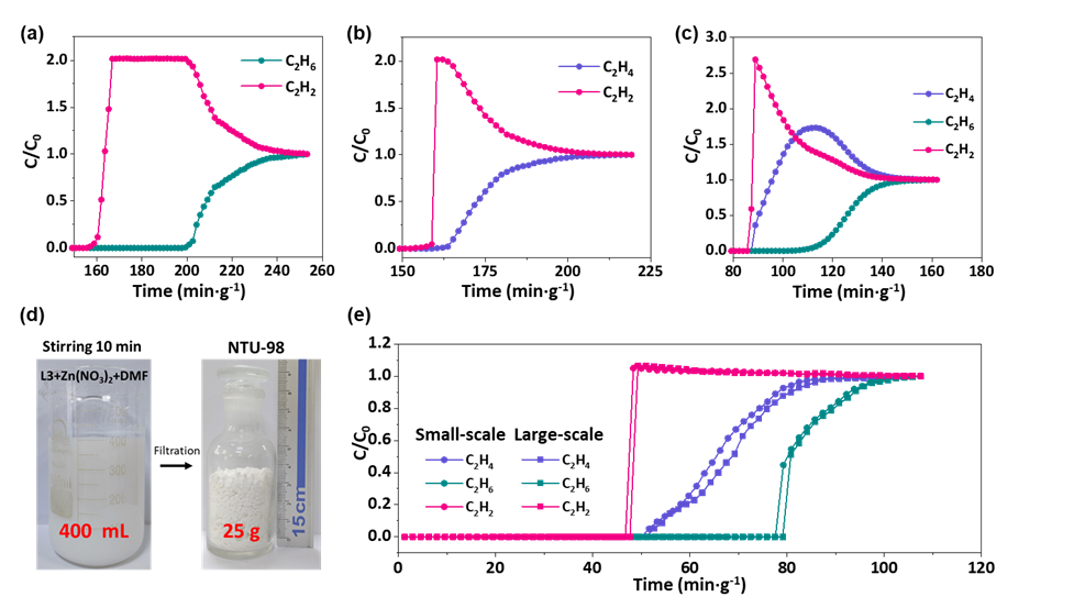 直接获取电子级乙炔被视为分离领域的重大挑战,其根源在于传统多孔材料普遍遵循“乙炔>乙烯>乙烷”的吸附偏好,难以实现从三元 C2 混合物中一步分离高纯乙炔。该研究通过配体官能团调控,实现了对该吸附顺序的完全逆转。研究者通过在吡唑-羧酸配体上引入三氟甲基和甲基基团,成功构建出一系列 MOF-5 类似结构的多孔晶体材料。其中表现最优的材料 NTU-98展现出完全反转的 C2烃类吸附趋势(乙烷>乙烯>乙炔),使其能够在室温条件下,实现从三元 C2 混合进料中“一次操作”直接获得纯度超过 99.99% 的乙炔。密度泛函理论计算与气体加载晶体学分析进一步揭示了分子层面的作用机制:材料孔腔中精确定位的甲基基团显著增强了其与乙烯和乙烷的主客体相互作用,同时有效抑制了与乙炔的结合能力,从而实现选择性的完全反转。