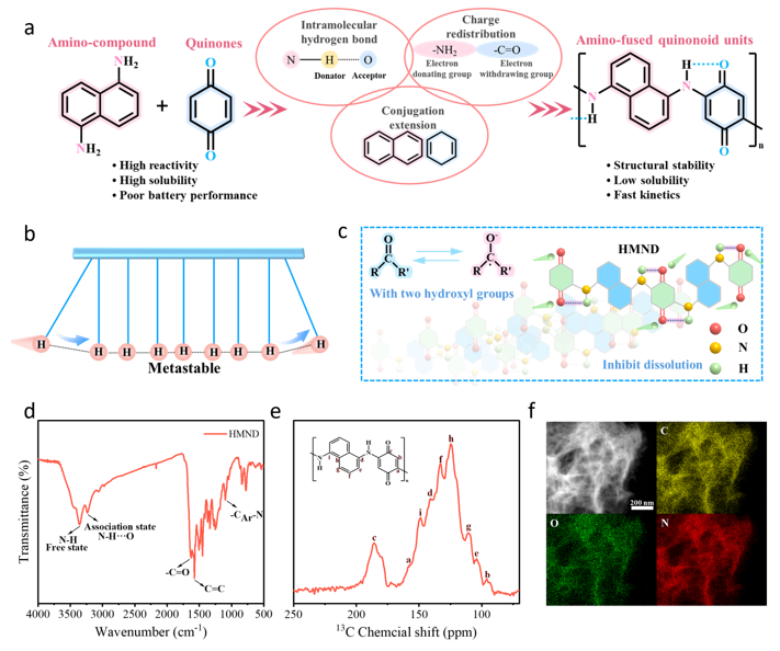 水系质子电池以其高安全、绿色环保和经济性优势,展现出广阔的储能应用前景。采用有机电极材料是满足其发展需求的重要方向,但该类材料在实际应用中面临一个关键瓶颈:即在电解液中易溶解,导致循环寿命急剧衰减。因此,如何通过分子设计与合成攻克溶解难题,成为开发高性能APBs的必经之路。本研究设计了一种具有分子内氢键的醌基聚合物(HMND)材料作为水系质子电池的负极。该材料通过-C=O中的O与-NH2中的H形成氢键(C=O⋯N-H),不仅显著提升了有机电极的循环稳定性,还通过格罗特斯机制加速质子传输,赋予其优异的倍率性能。MnO2@GF//HMND电池在8 A g-1的电流密度下实现了42,000次的长循环寿命,每次循环的容量衰减率仅为0.0018%,并展现出卓越的倍率性能(1 A g-1时为212.5 mAh g-1,70 A g-1时为91.4 mAh g-1)。该电池甚至在-60 ℃的冰冻电解液极端条件下仍表现出优异的电化学性能,显示出其在极端温度场景下储能应用的巨大潜力。